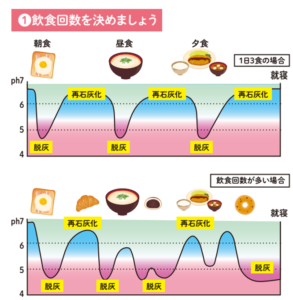 食事をするたびにお口の中では、「脱灰(歯が溶け出すこと)」と「再石灰化(溶けた歯が元に戻ること)」が繰り返されています。