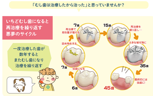 『乳歯はいずれ抜けるから、むし歯になってもいいんじゃない❓❕』と思う方もいらっしゃるかもしれませんが、乳歯にむし歯があるお子様は、永久歯もむし歯になる可能性が高いことがわかっています。
