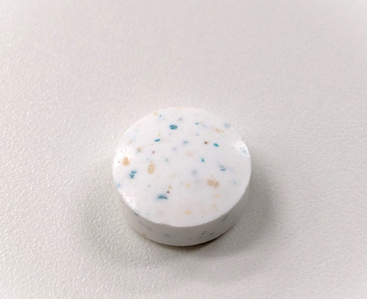 粒の大きさは1.5センチ程度。タブレットをよく見ると、薄褐色の点々がありますが、それが「生きたロイテリ菌」なんです!